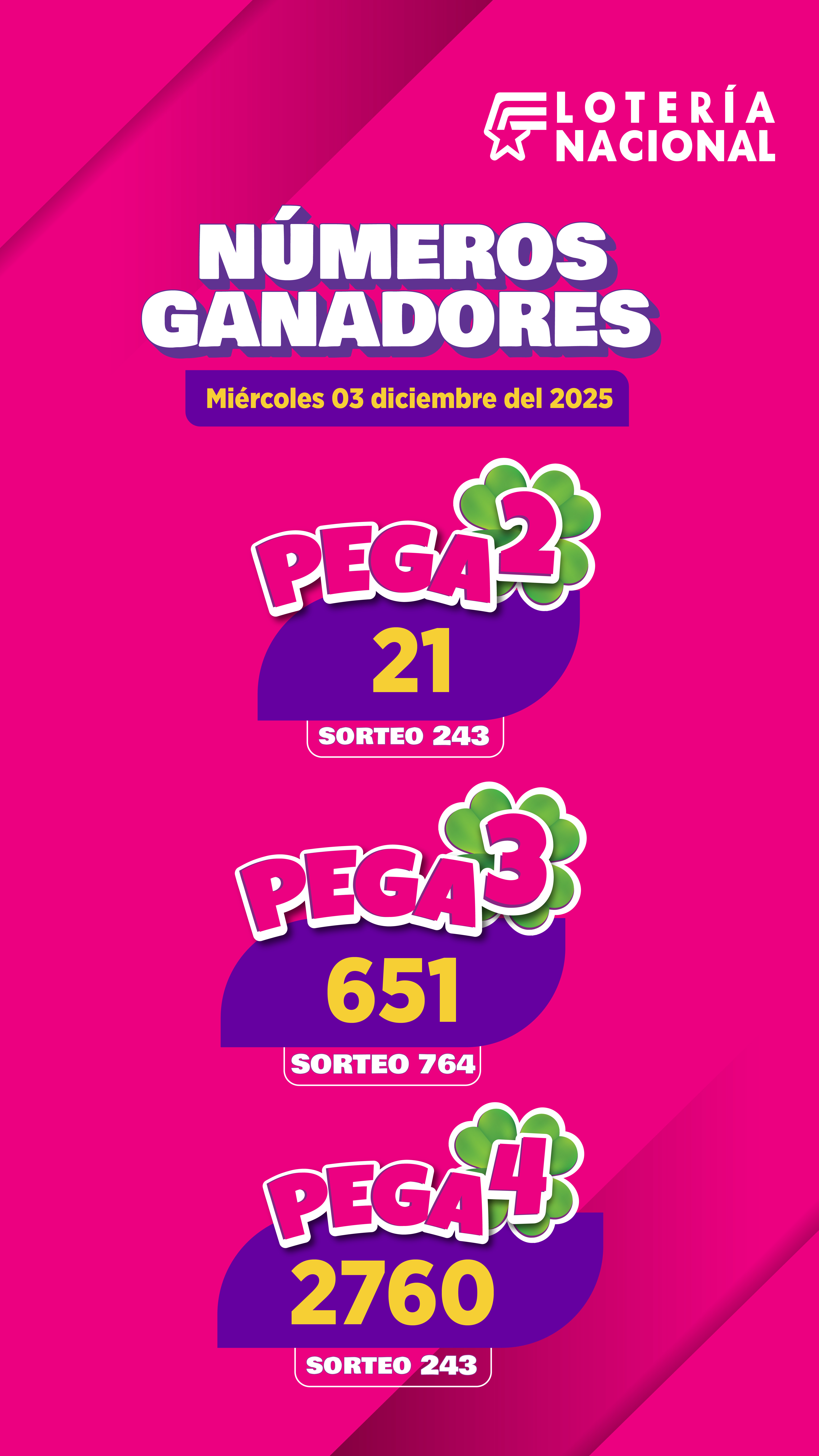 Resultados Pega3 del Miércoles 3 de Diciembre de 2025