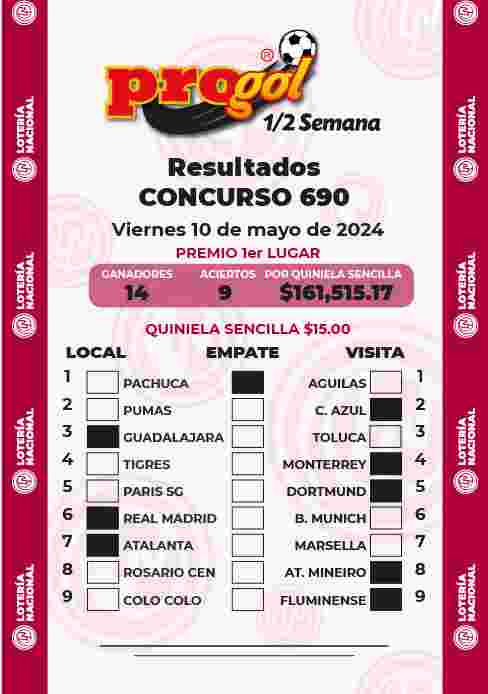Pronósticos. Resultados Progol media Semana 689 del Viernes 3 de Mayo de 2024. Comprueba tu boleto del Progol media Semana.