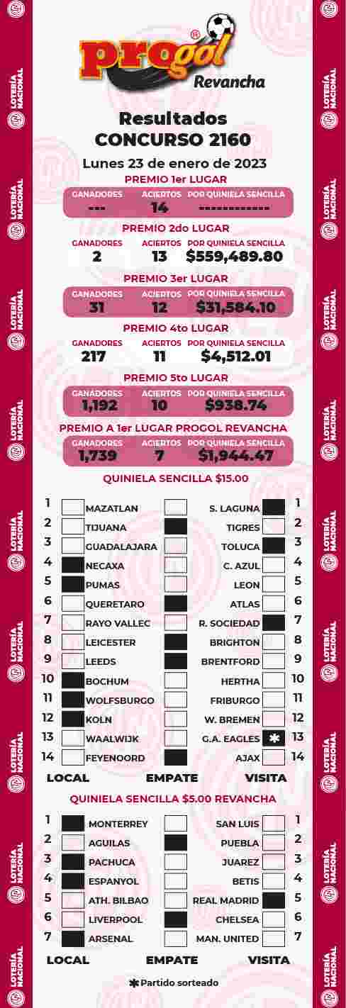 Pronósticos. Resultados Progol y revancha 2160 del Lunes 23 de Enero de 2023. Comprueba tu boleto del Progol.