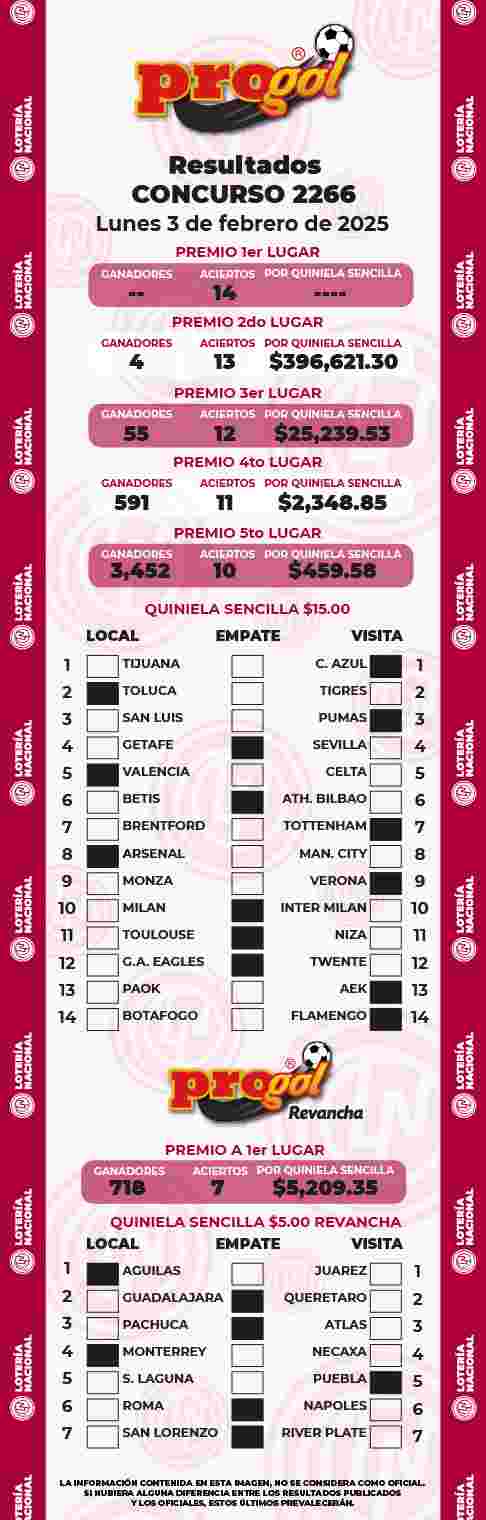 Pronósticos. Resultados Progol y revancha 2266 del Lunes 3 de Febrero de 2025. Comprueba tu boleto del Progol.