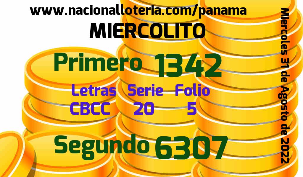 En el sorteo Miercolito correspondiente al día Miércoles 31 de Agosto de 2022, el segundo premio ha sido vendido en , el número ganador de este 2º premio es el 6307 al que le corresponde como premio un importe de $600. Además, este segundo premio lleva un premio de incentivo que se llevará quien haya acertado el segundo premio y lleva en el boleto las letras CBCC correspondientes al primer premio del sorteo, la cantidad que le corresponde a cada fracción del incentivo de este segundo premio es de $3000.